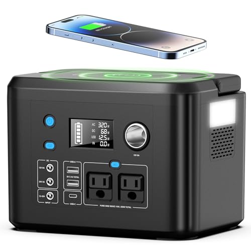 【POWER UP TO 9 DEVICES SIMULTANEOUSLY】: This portable power station has 2* Pure Sine Wave AC outlets (110V 350W ), 2* USB-A ports (5V, 3.1A total),1* USB-C port , 2* DC Outputs(12V 8A; 24V 3A) and 1* 12V DC car port to charge your devices, and 1 * 10W wireless charging pad are also equipped, no more worry about forgetting to take the phone charging cable on the trip.