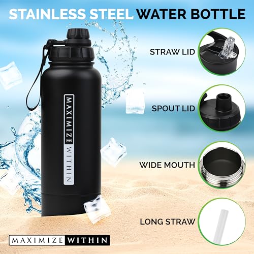 Double Wall Stainless Steel Water bottle with Dual lids (Straw & Spout) Hidden Compartment, Vacuum Insulated, Reusable. Black. 32 oz