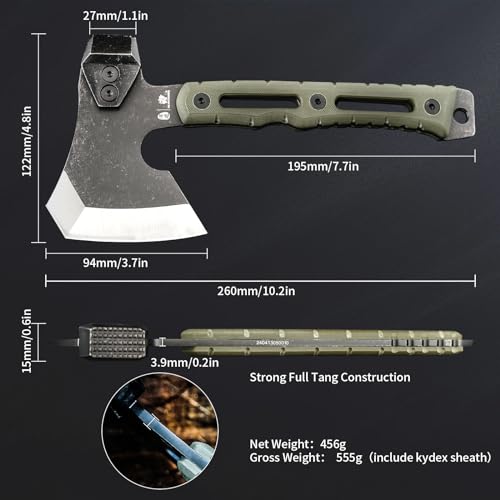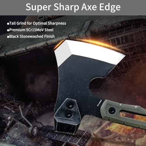 1. SHARP & STRONG CONSTRUCTION CAMPING AXE: The 5Cr15MOV Steel Heat Treated blade increases density, makes camping hatchet more durable. Tall grind for optimal sharpness, stays sharp longer. With black titanium plated and stonewashed surface, it features high wear, good rust and corrosion resistance. The 10 inch full tang outdoor survival axe is built for a better using experience.