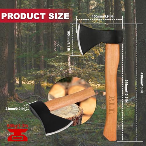 P.I.T. 15″ Hatchet, Wooden Handle Hatchet with Sheath for Wood Splitting and Chopping, Gardening Small Axe Wooden Handle Tools for Camping, Hiking, Multi-Use Axe