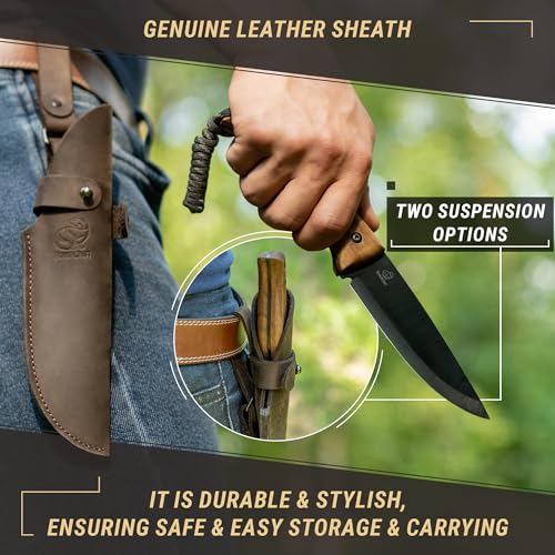 Bushcraft Knife Carbon Steel Blade: The bushcraft gear has a genuine leather sheath and two belt loops to provide safe and easy storage, ensuring your knife remains sharp and in good condition.