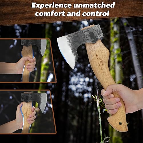 【Optimized Handle】Compared to straight handle, curved handle gardening hatchet is more ergonomic at specific tasks and provides a more natural grip for the hand. The curved handle bushcraft axe is better suited for continued use, as it helps to reduce fatigue in the wrist and forearm. And the unique shape allows it to fit different holding positions for different tasks.