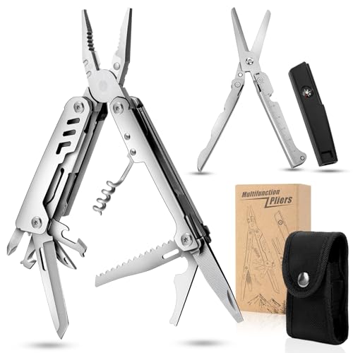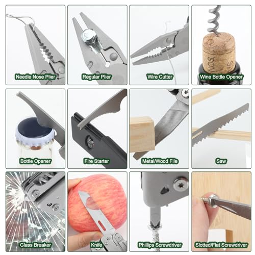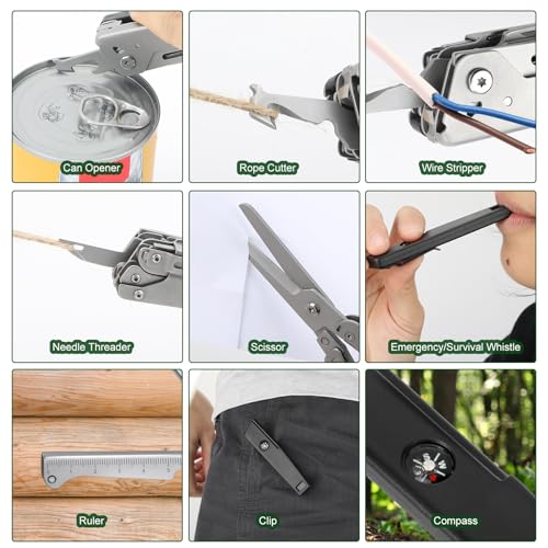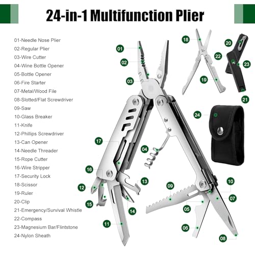 24-in-1 Multitool: The pocket tools includes plier, edc pocket knife, emergency whistle, compass, glass breaker, ruler, needle threader, nylon sheath, wine bottle opener, can opener, metal file, etc.