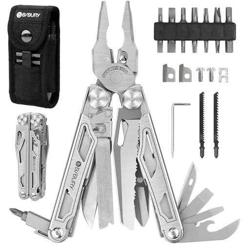 BIBURY Multitool Pliers Pro with Replaceable Wire Cutters and Saw, Stainless Steel Multi Tool w/Upgraded Scissors and Screwdriver Set, Multitools for Camping, Fishing, Survival, Gifts for Men – Silver