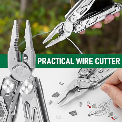 【All-in-one Multitool Pliers】This multi-tool with 31 tools including pliers, replaceable wire cutters, wire strippers, large scissors, punch, replaceable saw, knifes, wood/metal file, awl, bottle&can openers, ruler, 8 sets of screwdriver bit (PH1+PH4, SP8+SP4, TT25+TT20, TT15+TT10, SL6+SL5, SL4+SL3, H5+H4, H3+H2.5), ideal for outdoor activities, home works, daily DIY and more.