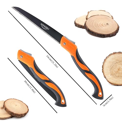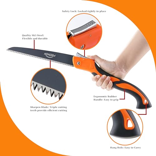 Folding Hand Saw, MONGSEW 9.5 inch Blade Pruning Camping Saw, Triple-cut Razor Teeth Tree Saw for Tree Wood Cutting Trimming, SK5 Carbon Steel, Ergonomic Handle