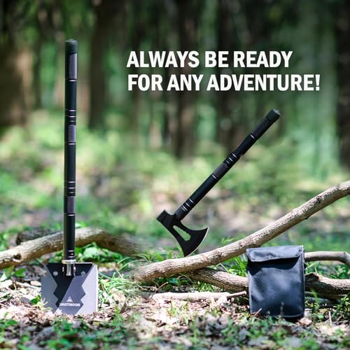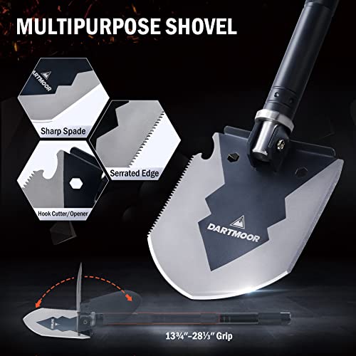 ALL-IN-ONE SURVIVAL KIT: Dartmoor’s multipurpose foldable shovel and axe set features everything you need for your next outdoor adventure, including a camping shovel with serrated saw edge and hook cutters, axe with various wrench profiles and flat hammer head, double edge knife, fire starter, emergency whistle, bottle opener, dual head screwdriver, and extendable shaft