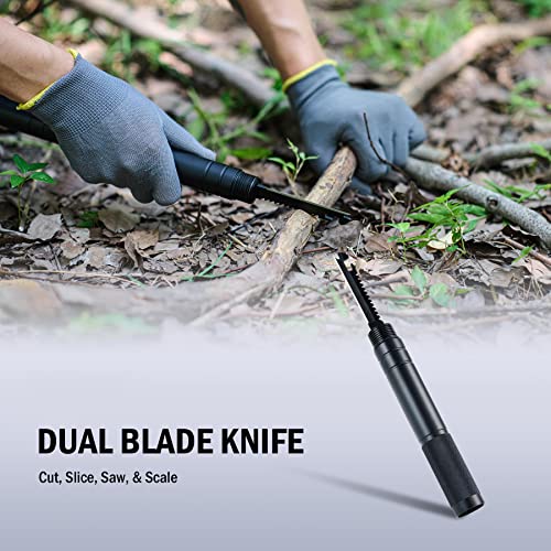 MULTIFUNCTIONAL TOOL SET: The rotating lock on the shovel collar allows you to switch from shovel to hook or hoe in seconds; the serrated edge on the shovel lets you saw branches for firewood and shelter, cut through ice, or break up packed dirt