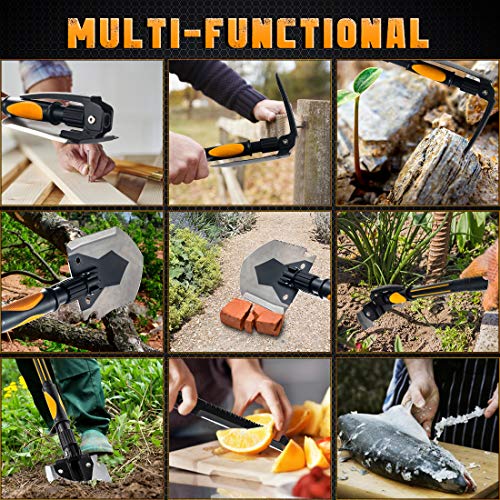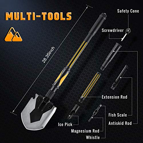 Survival Camping Shovel Multifunctional Folding Shovel 15-28inch Heavy Duty Alloy Steel Tactical Shovel with Saw for Hiking, Backpacking, Gardening, Hunting, Car Emergency, Snow