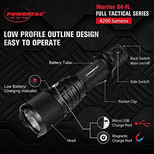 Powertac Warrior G4-FL 4200 Lumen (Wide Beam) Tactical Handheld Flashlight High Lumen, Waterproof, USB Rechargeable Flashlight and Dual-Charging Magnetic Police Duty LED Flashlight