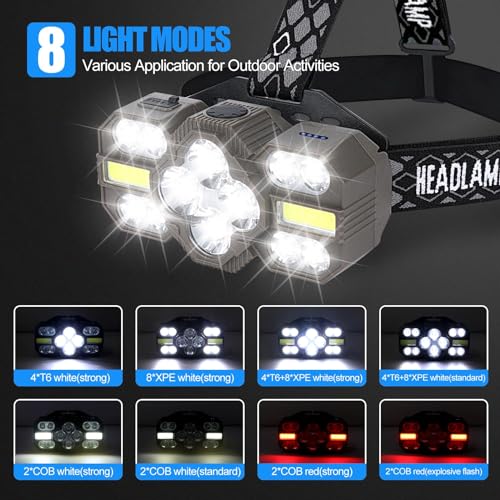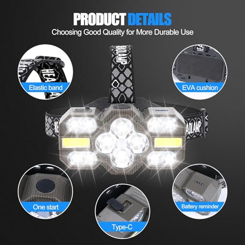Super Bright: Experience the Ultimate Outdoor Adventure with Our Super Bright Headlamp! Our head lights for forehead boasts 14 powerful LED lights, delivering an incredible 22000 lumens(single bulb 1800 lumens) of illumination. Equipped with advanced T6, XPE, and SMD LED bulbs, it’s your top choice for exploring caves, nighttime runs, stargazing during camping, and all your favorite outdoor activities. Upgrade your outdoor gear today!