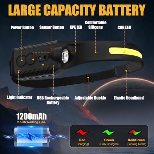 Motion Sensing & 5 Light Modes: The LED headlamp can switch between 5 different modes – COB high, COB low, XPE high, XPE low, and flashing. Easily select the desired mode with a press of the power button, and long-press to activate the SOS strobe light for emergencies. Ideal for various scenarios, this headlamp keeps you always prepared.