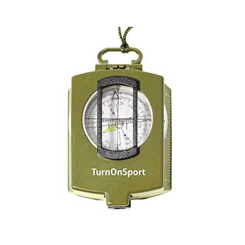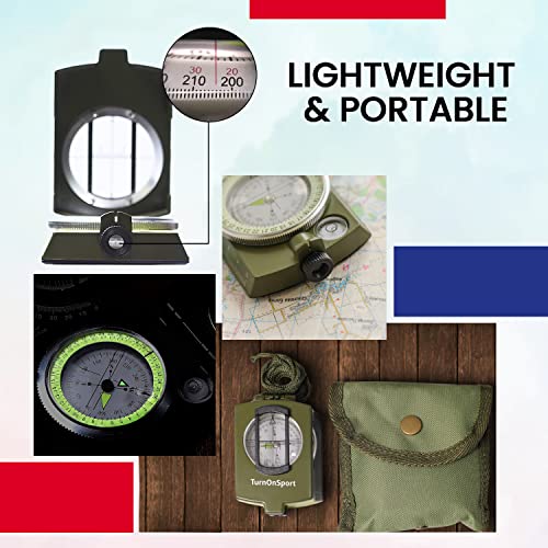 Lensatic Military Compass for Hiking – Tritium Compass Military Grade Style Camping Backpacking | Tactical Army Compass Survival Navigation | TurnOnSport Waterproof Sighting Compass with Pouch