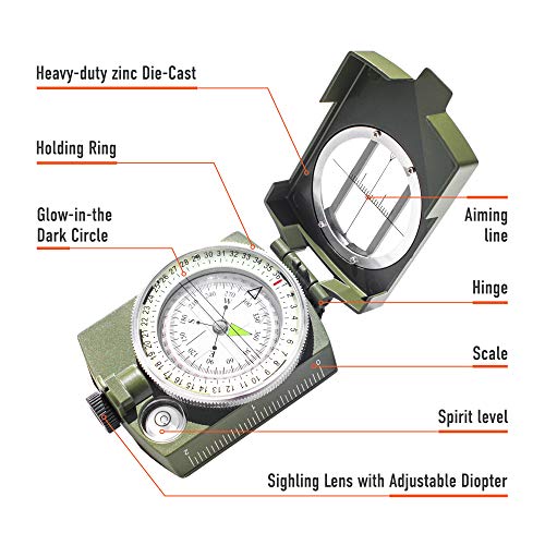 HIGH ACCURACY: Hiking military compass has bubble levels, a clear scale value, sighting lines on the cover, and a diopter sighting lens that can be adjusted, all of which can increase accuracy and reduce error