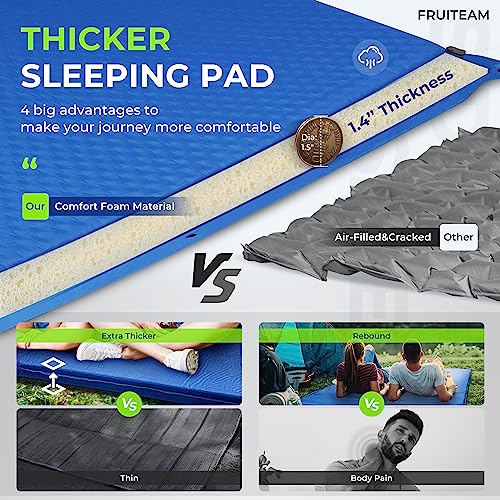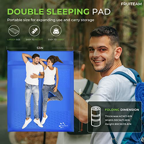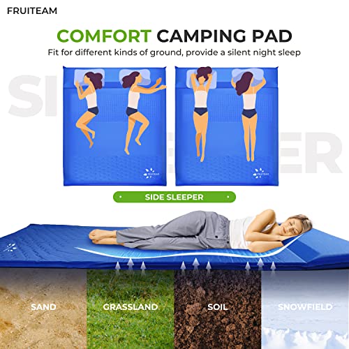 FRUITEAM Double Sleeping Pad for Camping, Self Inflating Camping Pad, Camping Air Mattress, 2 Person Camping Mat with Pillow, Inflatable Foam Camping Pad for Backpacking, Hiking, Blue