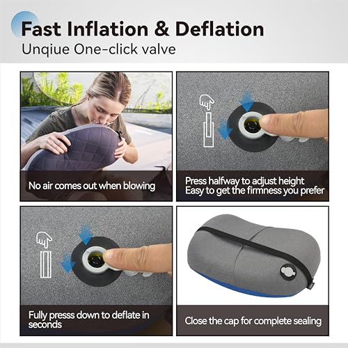 Convenient Click Type One-Way Valve: Inlet valve has a spring loaded stopper that self seals as you inflate. Click the button to blow and air it up to the fullest in only 3-5 breaths, click again to quickly deflate in seconds. Slightly hold on the button to slowly release air to your desired firmness or softness, easy to adjust the comfort.