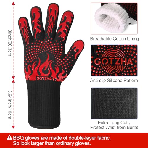 BBQ Gloves for Smoker, 1472℉ Extreme Heat Resistant Gloves, 12 Inch Silicone Non-Slip Grill Gloves with Extra Long Cuff, Safe Oven Gloves for Barbecue, Fryer, Baking, Outdoor Camping (Red)