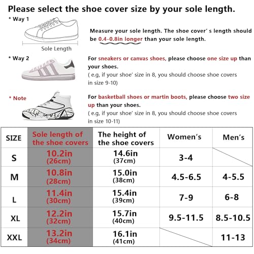 NOTE: There are five different sizes for optional, please measure your actual sole length before buying. We advise you to choose the size of shoe cover longer than your usual shoe sole length 0.5-0.8inch.