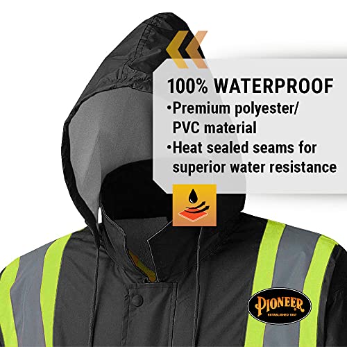 Meets ANSI 107-20 Class 1 and CSA Z96-22 Class 1 requirements. 100% waterproof polyester PVC – taped and heat sealed. Proprietary StarTech® reflective tape provides extra reflector visibility in all conditions. Jacket Features: back vents, adjustable hem, 2 large front cargo pockets; hood folds and zips into collar, full front zipper, drawstring with toggle hem. Bib Pant Features: high quality black elastic suspenders with non-corrosive plastic buckles, snap on hems to fit snug boots. Since 1887, Pioneer has grown a reputation for designing and building the highest-quality and most innovative protective and safety apparel. Using only the best and safest materials, componentry, and advanced sewing methods, Pioneer continues to deliver on safety, durability, comfort and value for the professional worker. Pioneer offers a complete selection of safety clothing including Hi-Viz gear, flame resistant wear, rainwear and much more. All our products are independently tested to meet and exceed all stated safety standards.