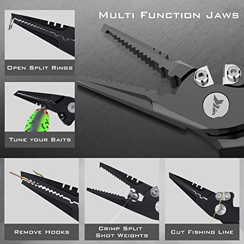Key Features – Fishing Tools – Corrosion resistant 420 Stainless Steel fishing pliers and fish lip gripper – Durable corrosion resistant coating – Tungsten carbide line cutters slice through mono, fluorocarbon and braided fishing line with ease – Open split rings to change hooks – Tune baits – Crimp split shot or build leaders.