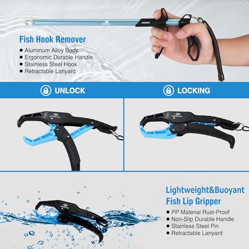 Lightweight and Rust-Resistant Fish Gripper — Our 8-inch gripper is 2.82 oz lightweight and buoyant, floating on water. The anti-slip handle and stainless steel jaws provide a strong hold without rusting. Say goodbye to lost catches