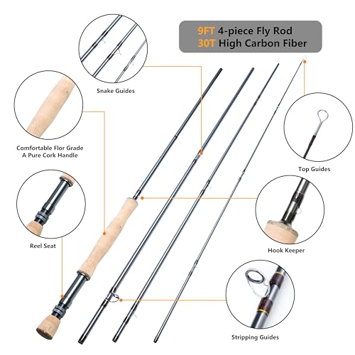 THE ROD:9’ 4-piece design, slow action fly fishing rods,fly rods made from 30T high carbon fiber.Double lock rings:the aluminum alloy reel seat with double lock rings for strong reel attachment.The reel seat is up to 9cm/3.54in long and adapts to various fishing reels;The cork handle helps with accurate casting and avoids fatigue.