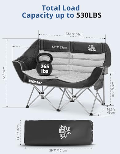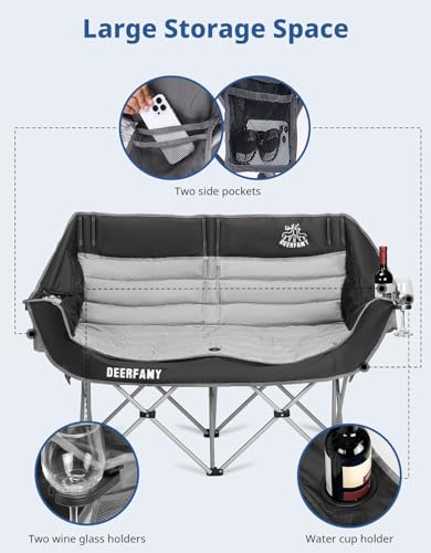 DEERFAMY Double Camping Chair Portable Folding Outdoor Loveseat with Cup & Wine Glass Holder for Outdoor/Beach/Patio-Supports up to 530 LBS(Grey)