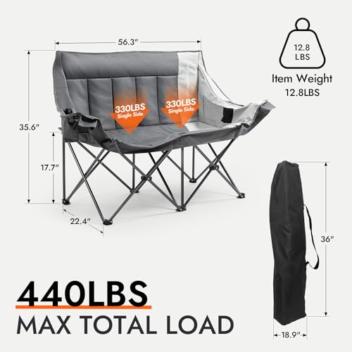 Premium Quality&Love Lasting: With a thick-coated heavy-duty metal frame, the double seat camping chair can hold up to 440 lbs, making it a great option for heavy individuals. The 600D seat fabric is strong and durable, suitable for indoor and outdoor use, ensuring that your camping chair will last for years to come.