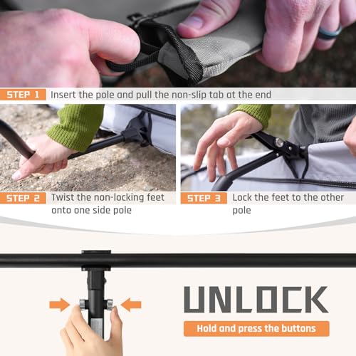 Organized & Quick-access: camping cots for adults with roomy side pockets and MOLLE straps. The side pockets are detachable and can be moved to any seat of the side. You can keep your phone, books, water bottles, and other camp gear clean and dry. The MOLLE straps can attach camping essentials and giving you even more storage options within arm’s reach.