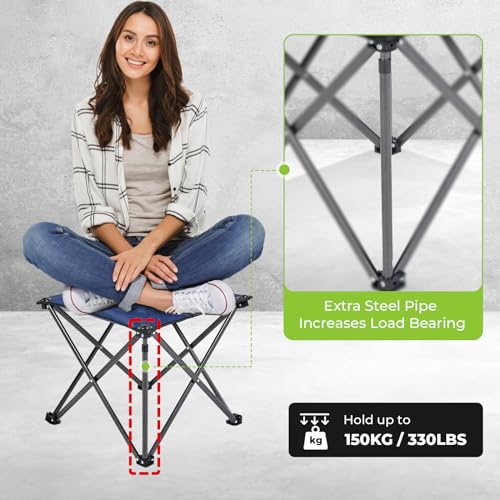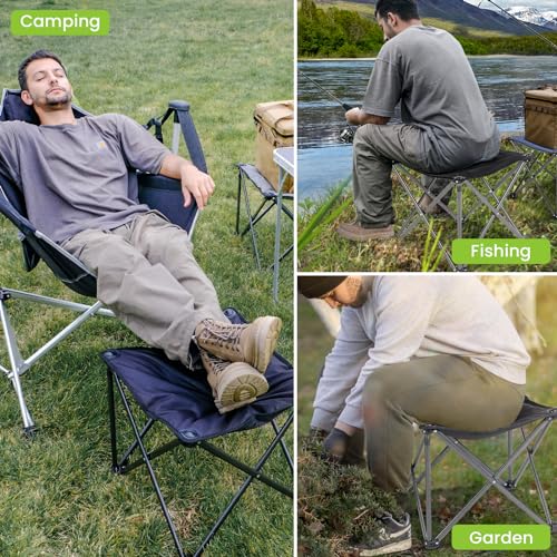 【DURABLE】Portable camping stool unique non-slip foot cover design suitable for all kinds of ground. Foldable Camping Chairs made of 600D double oxford and thickened steel pipe, not easy to tear and collapse after a long time of use. The additional vertical steel pipe design adds stability to the camping foot rest.