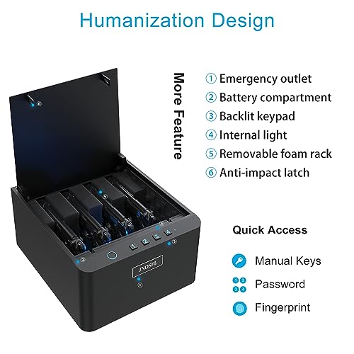 0.1s Quick Access: Our gun safes for pistols are equipped with an advanced 508DI fingerprint scanner. Additionally, they can store up to 120 unique fingerprints.
