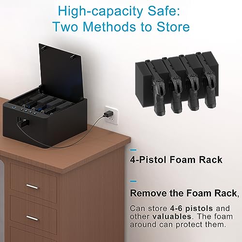 4-6 Guns Capacity: This high-capacity pistols safe for pistols can hold 4-6 handguns and other valuables.And there are removable foam racks inside to protect guns from bumping for better transport and storage.