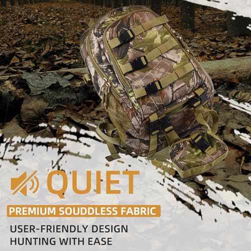SZIE & MATERIAL: 40L-Camo: (L) 12.6 ” x (W) 9″ x (H) 22″, with rifle holder; The backpack for hunting gear was made of 600D camouflage cloth, wear-resistant and durability, it is a good choice for hunting outdoor sports