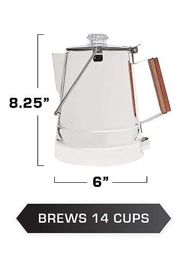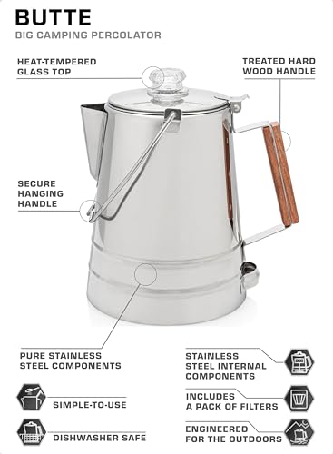 LARGE: Percolating for the entire camp is easy with this large 14 CUP coffee pot. Pack-in the Butte 14 Cup camping coffee percolator to your next outdoor adventure!