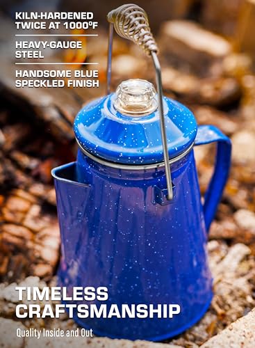 TIMELESS CRAFTSMANSHIP: Built from heavy-gauge steel, every piece of this stovetop coffee maker is kiln-hardened twice at 1,000℉. A handsome blue camping coffee pot built to last
