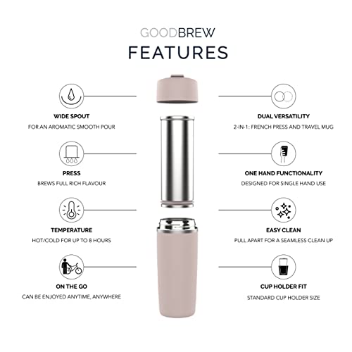 PROBLEM SOLVED! Unlike other coffee presses which require to use only with the cylinder, our uniquely developed product doubles as a TRAVEL MUG. This means that whether you want to keep your soup hot while camping, or simply use it as a take out at your favorite coffee shop or home, GoodBrew is the one and only all in one solution for the active on the go coffee and tea drinkers.