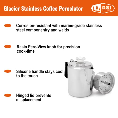 GSI Outdoors Percolator Coffee Pot I Glacier Stainless Steel with Silicone Handle for Camping, Backpacking, Travel, RV & Hunting – Stove Safe