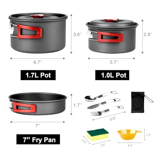 🏕️【13 PCS CAMPING COOKING SET 】 – This camping cooking set includes 1.7L pot, 1L pot, 7″ fry pan, 2 pot cover, 3 BPA-Free bowls, 1 stainless spoon knife and fork set, 1 cleaning cloth, and mesh bag, perfect mess kit for 2-3 people.