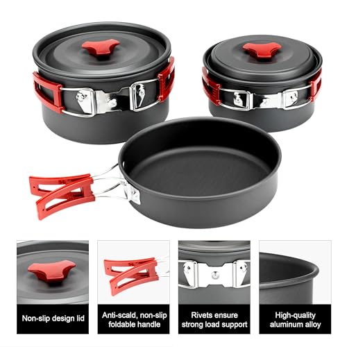 🏕️【HIGH-QUALITY & HEALTHY MATERIALS】 – The camping cookware made of quality anodized aluminum and food-grade silicone material that meets European and American food safety standards, ensuring safety and health. Our camping essentials is non-toxic, lightweight, high temperature resistant, scratch resistance, oxidation resistance, easy to clean, and quick heat transfer saves time and fuel.