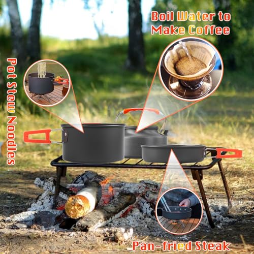 Camping Cookware Set, Non-Stick Lightweight Camping Pot and Pan Set with Stainless Steel Kettle Plates Spoon for Backpacking, Hiking, Outdoor Cooking and Picnic