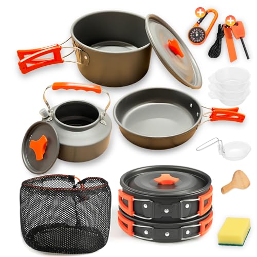 Camping Cookware Mess Kit🏕️: the 11pcs Camping Cookware Set Is Perfect for 1-2 People. Package Includes: 1*59.9oz Camping Pot (6.69*3.54 Inch),1*35.2oz Frying Pan(7*1.77 Inch),1*35.2oz Camping Kettle,3 Bpa Free Silicone Folding Bowl ,1 Silicone Folding Spoon,1 Rice Spatula,1 Loofah Slice,1x Net Bag for Storage, 1 Flient(3 colors randomly), 1 Mountainerring Buckle Compass(7 colors randomly).
