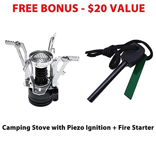 BEST PRICE/BEST VALUE: 17pcs camping cookware accessories set includes FOLDING STAINLESS STEEL SPORK + SPOON + FORK + KNIFE + MINI STOVE WITH PIEZO IGNITION + Hard Anodized Aluminum Nonstick Pot (1 Liter Capacity) + Nonstick Frying Pan + Pan Cover + 2 BPA Free Bowls + BPA Free Soup Spoon + Rice Ladle + Loofah Sponge+ Carabiner + Nylon Bag + Fire Starter