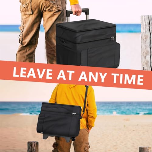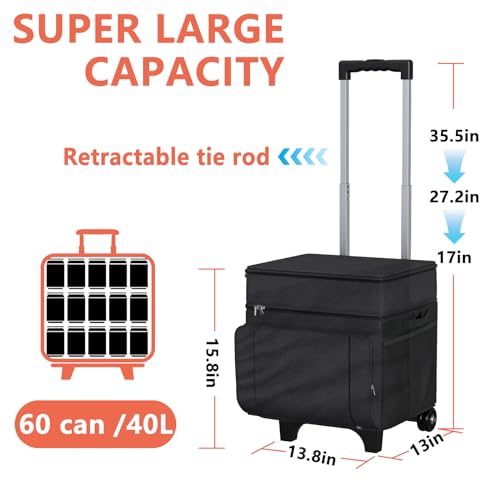 Large Rolling Cooler: Cooler with wheels Standing at 15.8*13.8*13 inches with a capacious 40L and holds up to 60 cans. The cooler bag has 1 zipper front pockets and 1 top zipper pocket, allowing you to accommodate any combination of food, containers, and drinks.