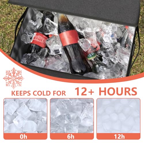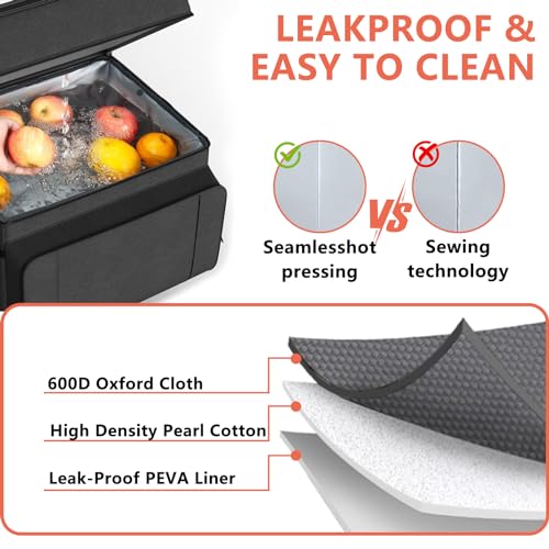 Insulation and 100% Leak-proof : The exterior of cooler is constructed out of 600D which making it durable and reusable. Inner high-density foam and thick PEVA insulation material keep your drinks and food cool for 12 hours with ice packs. Hot-pressing seamless liner with insulation layers ensure the rolling cooler on wheels is 100% leakproof.