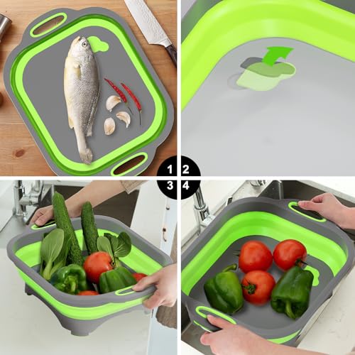 2 in 1 Cutting Board -Foldable sink can be used to wash dishes, vegetables, fruits. Collapsible cutting board can be used to cut meat, vegetables and fruits alse used as a storage basket for storing various foods and drinks, which effective save your money, time and space.