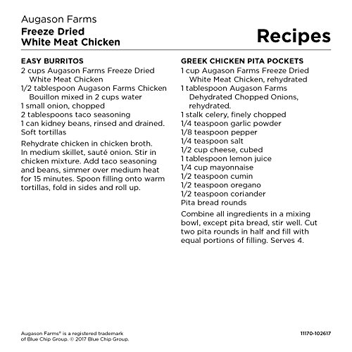 The Augason Farms Freeze Dried Chicken Breast Chunks 16 oz Number 10 Can are a quick and delicious way to add chicken to any dish. Naturally low in fat, you simply rehydrate these pre-cooked chunks of real poultry and then use them as you would cook chicken. These tasty morsels can be added to pastas, stir fry, casseroles, salads, sandwich mixes, enchiladas and a variety of other recipes. This is an all natural product that consists of 15 Servings and 2, 100 Calories, with a shelf-life of up to 25 years. All this convenience makes it perfect for Food Storage, Emergencies, Survival, Camping, and Everyday Use! Make the wise decision and let Augason Farms give you a peace of mind that’s as indispensable as it is delicious. Family owned and operated since 1972, Augason Farms believes that great taste is a tradition worth preserving. They’ll provide you with delicious peace of mind with their food essentials. Please discard oxygen absorber after opening. Best when stored in a cool dry place at temperatures between 55 Degree and 70 Degree F (ideal humidity 15%).