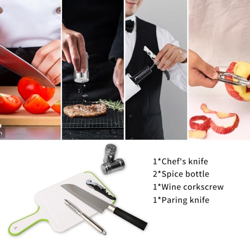 Camping Cooking Utensils Set:Camping accessories include chopping board*1, spatula*1, soup ladle*1, bread clip*1, scissors*1, wine corkscrew*1, chef’s knife*1, barbecue fork*1, spice bottle*2, paring knife*1, apron*1, towel*1, non-slip gloves*1 and storage bag*1. This is a complete set of camping utensils to meet all your needs.