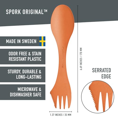 SAY GOOD-BYE TO DISPOSABLES our camping utensil set spork is the only “on-the-go cutlery” you will ever need for eating on outdoor wilderness adventures. Starve the landfills with our responsibly made utensils. 2 sporks included. Rustyorange/Slatyblack