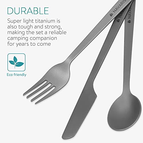 Navaris Titanium Camping Cutlery Set – Lightweight Camping Utensils for One – Knife, Fork and Spoon with Carabiner Clip and Case for Hiking and Travel
