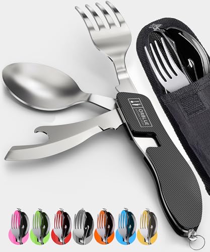 Orblue 4-in-1 Camping Utensils, 2-Pack, Portable Stainless Steel Spoon, Fork, Knife & Bottle Opener Combo Set – Travel, Backpacking Cutlery Multitool, Black